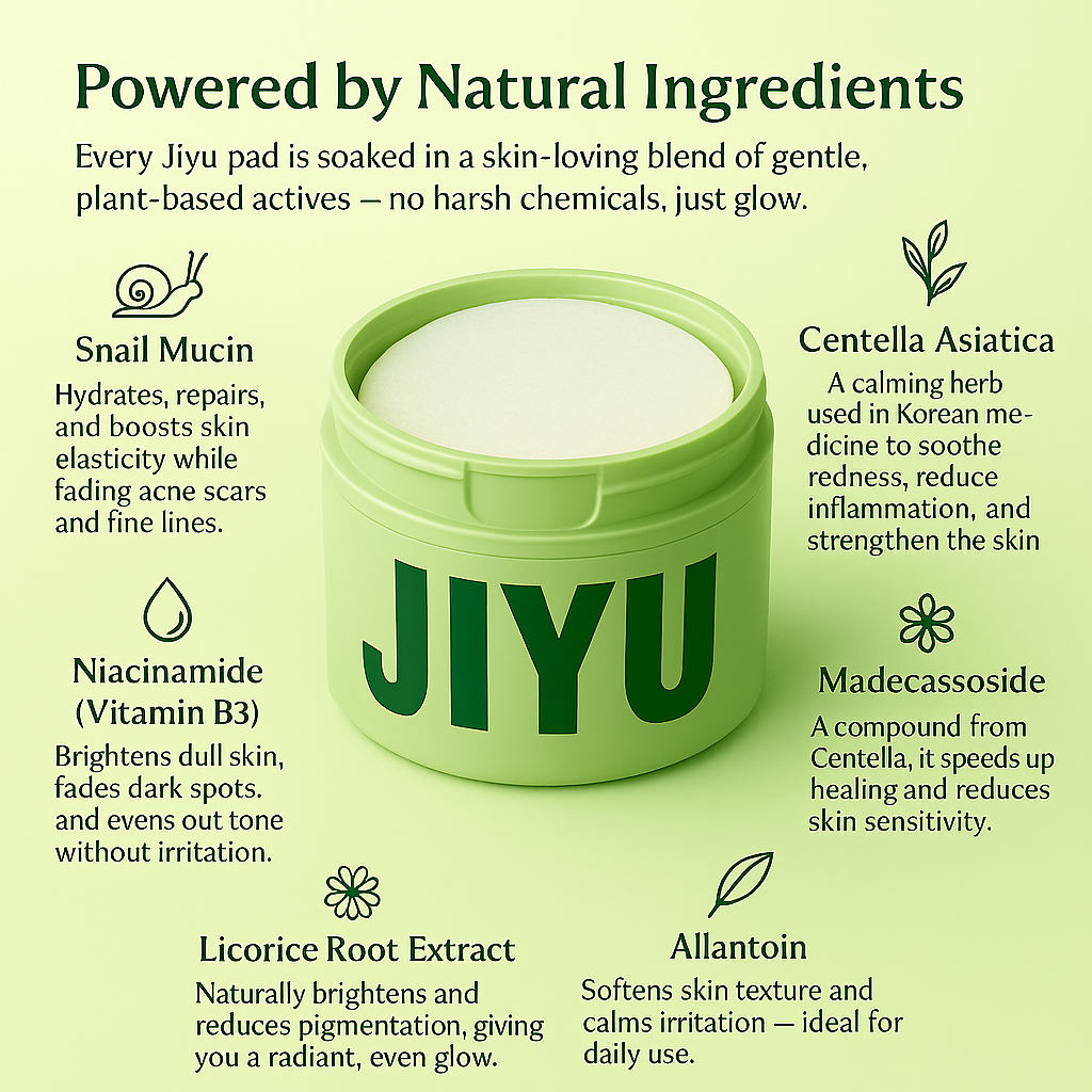 Every Jiyu pad is soaked in a skin-loving blend of gentle, plant-based actives — no harsh chemicals, just glow.