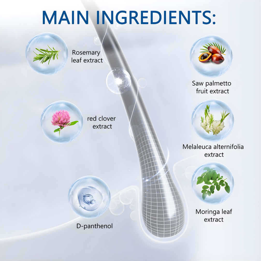 💧 Rosemary Leaf Extract – Boosts circulation to the scalp, helping revive dormant follicles and promote faster, thicker growth.